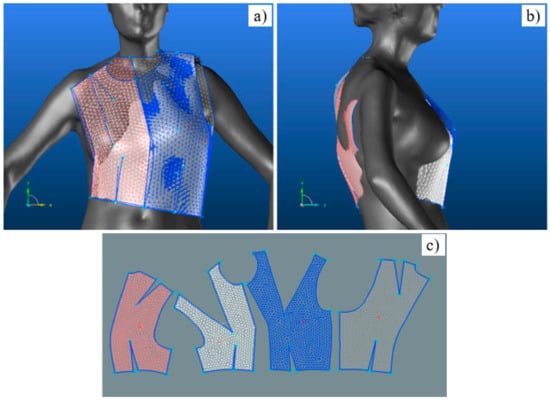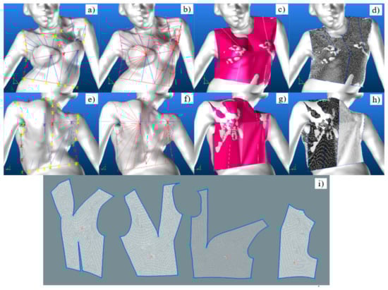- The triangular mesh of the surfaces of each pattern of the garment block pattern (Figure 6d,h);
