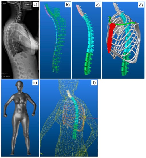 3D model of the thorax (a) The EOS medical images, (b,c) orientation of the spine in the coronal plane (d) 3D thorax model, (e) scanned body, and (f) modelled spine integrated into the patient’s. Adapted from ref. [23].