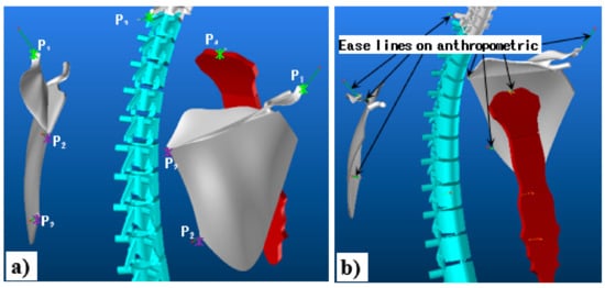 The 3D Geometric model of a garment with 3D ease allowances starts with detecting anthropometric points on the skeleton of the 3D thorax model. Here, as shown in Figure 9a, there are three points to detect for each scapula. The first point is for the acromion (P1), the second is for the salient points (P2), and finally the third point is at the end of the seventh cervical (P3). Besides, there is also an additional one point (P4) on the upper/middle part of the manubrium (jugular notch between the two clavicular facets) as shown in Figure 9a. Those different marks are placed on the anthropometric points to create the ease allowance of each point as shown in Figure 9b by the green lines.