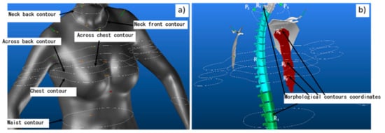 Detection of morphological contours on the (a) 3D body model and (b) with coordinates on the skeleton.
