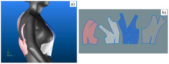 Modelling the 3D garment on the virtual body becomes one of the critical techniques required to implement the designing of not only technical products [9,10] but also functional garments for disabled people [11]. For example, some research work proposed 3D modelling in relation to the virtual fitting by setting up a 3D wireframe model of the garment connected to the wearer by its morphological contours and anthropometric points [1,12]. Another study works on the new design method and virtual prototyping of garments using CASP (curvature, acceleration, symmetry, proportionality) for people with scoliosis peoples taking into account the deformed areas of the body [13]. In general, the design of the garment is carried out directly on a mannequin or wooden mannequin with many precise and repetitive adjustments [14]. This step, commonly known as the draping technique, requires expert manual know-how [15]. Other design methods such as 2D model creation methods are also widely used as they are highly practiced today in a digital environment. Both designing systems not only reduce the time of the design stage following an increasing demand [11] but also represent a possible solution which is cost-effective if implemented in a 3D environment [16,17]. Besides, for the last few decades, adaptive clothing was designed based on a digitized human body by characterizing each body part including the chest, shoulders, scapula, neck, back, hips, lateral parts, etc. However, such designing methods of a sophisticated 3D virtual garment model for a 3D virtual human model are still labor-intensive since most existing garment models are custom-made for a specific human model and cannot be easily reused for other individuals [18].