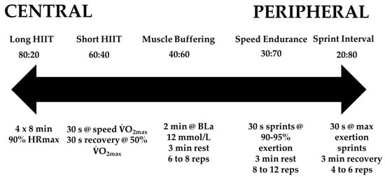 Physiological targets for high-intensity conditioning reside on a continuum, rather than in discrete areas and a target is never exclusive to a single physiological adaptation. Figure 1 provides examples of the typical high-intensity conditioning sessions and position on the high-intensity continuum. It is generally considered that peripheral targets include the neuromuscular system and myocytes and central targets include the cardiovascular system [,].