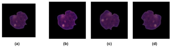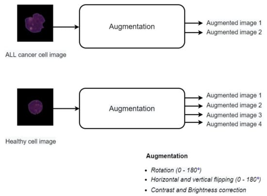 Data augmentation techniques can be used to overcome the problem of the limited size of a dataset, specifically in deep learning problems. Several techniques for image augmentation such as flipping, cropping, and rotation are used to obtain different copies of the original image. It gives the algorithm more generalization capabilities when we train our system not only with original images but with augmented images too. It has been stated that training a system with augmented images reduces the error rate and provides better generalization [41,42,43,44,45,46]. The CNM-C 2019 is an imbalanced dataset that may degrade the performance of deep learning models. Data imbalanced problems usually cause overfitting and lead the model towards poor generalization. In order to avoid the problem of overfitting and to increase the number of images in the dataset, we used different data augmentation techniques such as rotation, horizontal and vertical flip, brightness correction, and contrast adjustments on the training dataset. The augmentation on images is applied on the run for every single image. Every time the model gets an image, it loops through the image and generates four augmented images in case of healthy cell images and generates two images in case of ALL cancer cell images, as shown in Figure 2.