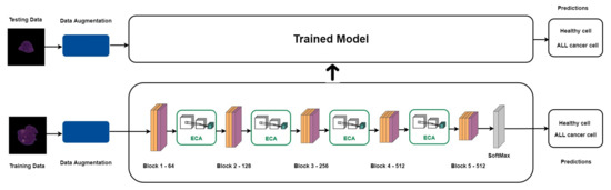 Human biological processes are the best approaches to demonstrate the intuition behind attention. For example, in order to assist perception, our visual processing system selectively focuses on specific portions of the image regardless of extraneous information [53]. The ECA module extracts the information from each channel of VGG16 results in a weighted sum of all the aggregated features. This allows the deep learning model to assign greater weight to certain elements of the input images. In Section 4.2 we show the feature maps generated by our proposed method clearly presented that our model focused on the cell itself rather than the image background. Attention modules are used to help CNN learn and to focus on more important features, instead of learning non-useful context knowledge. In order to learn more deep features, ECA has been employed after every VGG16 block. The ECA module helps to avoid feature dimensionality reduction caused by the convolutional block which inevitably brings side effects and is conducive to capturing the dependency between the channels. The ECA module only involves few parameters to explores the local cross-channel interaction by implementing a 1 × 1 convolution via adaptive selection of the kernel size k. In our proposed model we used k = 9 extra parameters with our backbone VGG16 following the original ECA paper. Gradient descent is also utilized to optimize these parameters. ECA module can increase the information interaction between channels of the feature maps, reduce the model complexity, and maintains the performance.