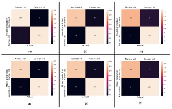 Table 4 present the results of each fold’s performance for VGG16 with and without attention module. Our proposed VGG16 with the ECA module outperforms plain VGG16 by identifying the most pertinent information in an input image and aids in classification accuracy. Adding the ECA module helps the model increase the model performance (the attention module does not ignore the irrelevant features, but it just diminishes their importance). Table 5 and Table 6 represent the evaluation matrices of VGG16 with and without attention module obtained from different folds. In ALL classification, we can see that fold-1 produces the best mean accuracy result for cancer and healthy cell images. We can presume that the sample selection for the training set can significantly affect the performance results. Figure 6 provided the receiver operating characteristic (ROC) curves generated in different folds on testing data, while Figure 7 shows the confusion matrices obtained from the proposed method. It can be seen that the proposed method successfully identified most of the cell images in their respective classes. The obtained results suggested that the ECA module helps to improve the model prediction. We tested our approach using six-fold cross-validation since it produces more trustworthy findings in evaluation.