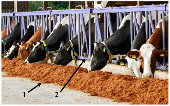 Schematic diagram of the pusher robot travelling along the cattle farm. 1—pusher robot, 2—robot movement trajectory.