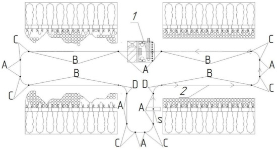 Section (B)—the robot moves in a straight line along the feed table with slight deviations depending on the degree of spread of the feed by the animals. In the process of moving along section (B), the pusher auger rotates at a speed of 80 to 120 rpm, and the feed additives are dispensed from the dispenser hopper.