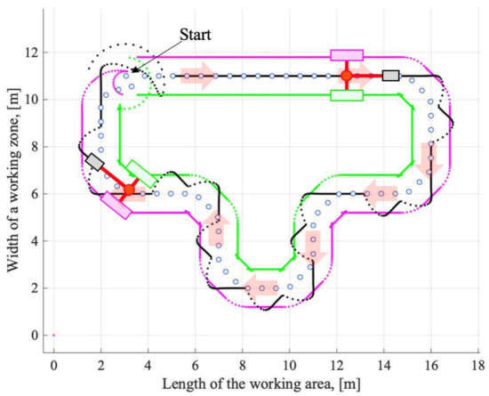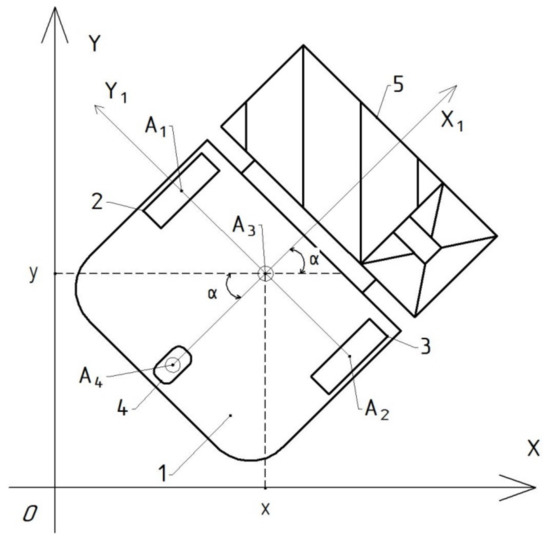 At the designing stage of the pusher robot control system, the expected trajectory of the robot motion was modeled. For autonomous positioning of the designed robot, its motion trajectory should be elementary; it moves in a straight line with minor deviations depending on the amount of feed residue on the feed table (Figure 2).