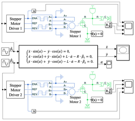 The aforementioned signals are also fed to the stepper motor controllers of the driving wheels, which generate control actions to operate them. Within the framework of the dynamic model, ready-made control blocks for stepper motors of the Simulink library are used. The motor control logic contained in the Stepper Motor Driver 1–2 blocks is a controller. The developed model makes it possible to change the geometric data of the mobile platform of the robot and design the transient processes of the dynamic and kinematic structural components.