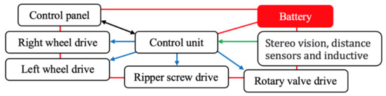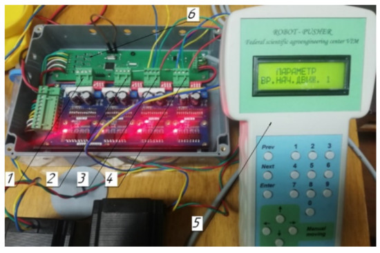 The way of implementing the control system for the pusher robot is shown in Figure 10. The control unit consists of two boards, one of which is a driver for controlling the electric motor; the second board processes incoming signals from the sensors of the positioning system and the console to change the parameters of autonomous operation.