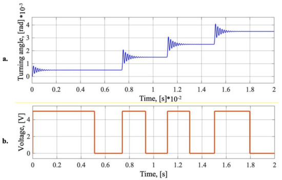 Figure 9 shows the transient processes of the rotation angle of the stepper motor shaft (a) and the control action received by the stepper motor controllers (b). Evident from the characteristics, the control action turns the engine rotor rigidly fixed to its shaft, thereby making it rotate. Nevertheless, the system has an inherent overshoot during positioning, observed in the transient response (a).