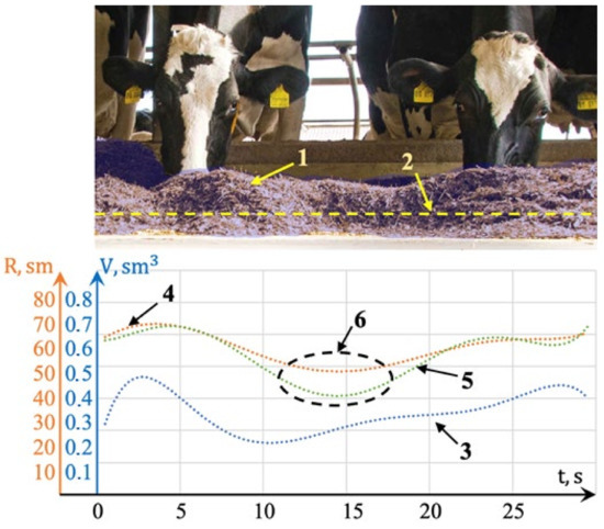 Transient characteristics 4 and 5 are the signal from the distance sensor and the result of the linear interpretation of the data from the binocular vision system, respectively. The linear interpretation of the data in the intelligent algorithm is an array of points that lie on the surveyed distance sensor path but are generated from the data acquired from the binocular vision system. The presence of short-term discrepancies (shown in Figure 11, 6) indicates the milking animal’s activity during feeding at the moment of feed dispensing. The data were obtained from the binocular vision system or a distance sensor. If discrepancies are not short-term, the operator will receive a message to check the attachment of the distance sensor and the binocular vision system.
