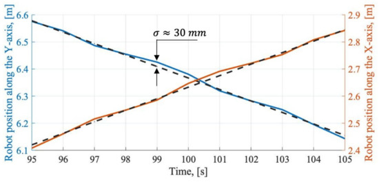 Figure 13 shows simulated trajectories of the x and y coordinates of the gravity center of the mobile robot. The dashed lines represent the specified trajectories, the solid lines represent the results of modeling the developed intelligent algorithm. It is apparent that the maximum mismatch error between the set value and the result of modeling the positioning of the mass center of the movable platform reaches σ ≈ 30 mm.