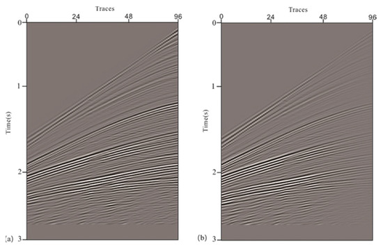 The shot-domain RTM migration outputs the zero shot–receiver distance profile, namely, the stacked profile, and in this study, the strategy of attribute migration was used to output SOGs from the RTM calculation. According to the aforesaid theory on attribute migration, it was necessary to calculate the values of offset at imaging points using the ratio of the results from the migration of the modulated and original shot data, thus sorting to obtain the migrated SOGs. Compared with the stacked profile RTM calculation process, the two kinds of migration results are the same, except for the input receiver data, and other imaging elements are the same. Therefore, only the RTM calculation process needs to be modified in order to be used in a calculation to output the offset gathers; thus, the calculation process is now as follows: the shot wavefield is forward-propagated to the boundary where it is randomized and then backward-propagated; the wavefields of both the receivers and the modulated receivers are backward-propagated, respectively; one shot wavefield and two receiver wavefields are coherently imaged at the same time, outputting results from two kinds of single-shot migration; the ratio of the two wavefields is used to obtain the offset attribute, thus sorting to generate SOGs. The above calculation and sorting are completed shot by shot and obtain the final results of the imaged SOGs.