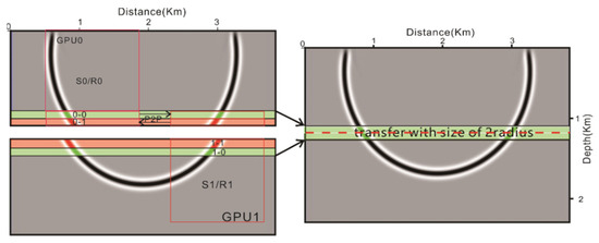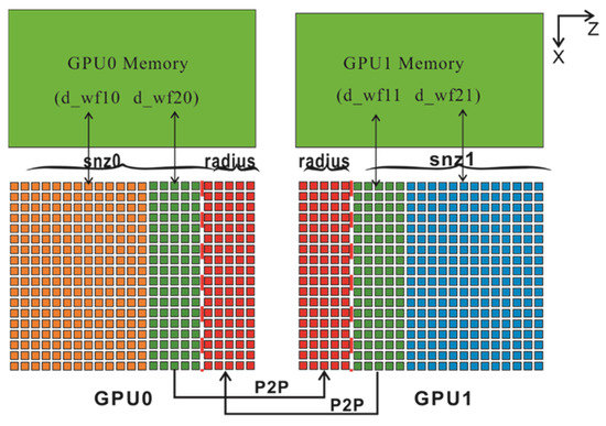 Figure 7. The entire imaging space was divided into two independent parts in the z direction, which were calculated with GPU0 and GPU1, respectively. Some of the overlapped domain was used to exchange boundary data at different times of propagation, and the radius was determined by the finite-difference order. For each GPU computation, we focused on the management and calculation of data in the overlapped domain, which involved data transmission between two GPUs. To realize the overlap of calculation and data transmission, it was necessary to adopt different methods when dividing the computational domain. For example, for GPU1 computations, the computational domain partitioned to it was further divided into three parts, of which, d_wf11 and d_wf21 were calculated in different job streams, respectively, and after d_wf20 was computed, it was directly exchanged to the corresponding domain of GPU1 through point-to-point transmission, and GPU1 was calculated using the same process as for GPU0. Here, the magnitude of d_wf20 and d_wf11 was by the order of spatial finite difference and was much smaller than that of d_wf10 and d_wf20. If the computation and transmission of a small domain on a single GPU are placed in the same stream, when the computation is not completed in the larger domain, the computation and transmission are completed in the small area, so the transmission of data between different GPUs is completely concealed.