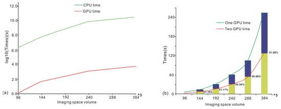 Figure 11 is a computation time comparison when the imaging space is 384 × 384 × 384; we can see that when more GPUs are used, the speedup can be nearly linear.