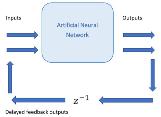 RNNs are widely used to analyze the structure of time series data [18]. They hold feedback connections. Contrary to feed-forward networks, the dynamical properties are crucial. In other words, some of the outputs are routed back as inputs with a delay, and these feedback neurons are the ones that keep the state variables (Figure 2).