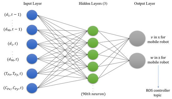 To train the network, the mobile robot was operated in the proposed simulated dynamic environments and the velocities and sensor data labels were recorded at each time instance, which in this case, was every . Two additional parameters were added: the desired target point location in for the mobile robot and its odometry pose in coming from the odometry topic of the ROS. The target point was fixed, while the odometry pose of the robot varied every time instance .