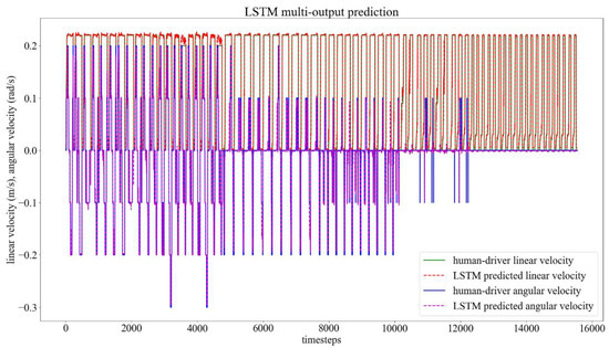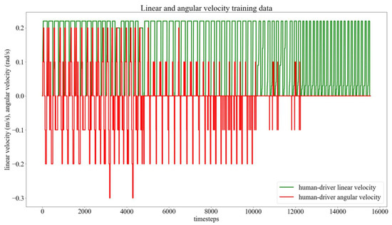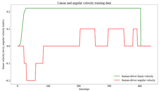 Further experimentation included several trajectories to train the network. Figure 10 describes many trajectories and navigation examples provided by the user through the velocity commands to the LSTM model. The linear velocity in in of the mobile robot is represented by the green line, while the angular velocity in in is represented by the red line.