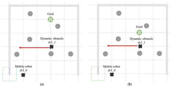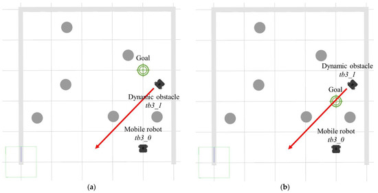 As the dynamic obstacles can be any moving objects and/or persons, another TurtleBot Waffle Pi was added to the simulation representing the dynamic obstacle, labeled as , while the main mobile robot was marked as . Three different scenarios, shown in Figure 5, Figure 6 and Figure 7, were constructed to test the robustness of the proposed LSTM model under different conditions for the dynamic obstacle and the mobile robot. Each simulation scenario could be called through the roslaunch tool, which is the standard method for starting multiple ROS nodes, placing multiple robots, and bringing up the simulated world in Gazebo [34].