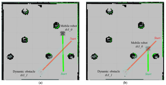 Figure 17 and Figure 18 show an intersection of the green and red path lines of the mobile robot and the dynamic obstacle, but there was no collision, since