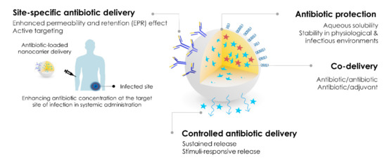 Overview highlighting the main advantages of a nanocarrier-based antibiotic delivery approach for the treatment of bacterial infections. Depending on the targeted therapeutic applications, nanocarriers may be engineered to improve different pharmacokinetic parameters of antibiotics, resulting in increased therapeutic efficacy and reduced adverse side effects.