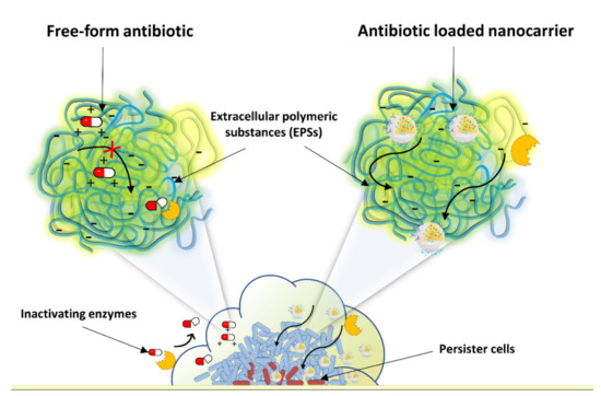 Schematic illustrates the protection mechanisms of antibiotic-loaded nanocarriers from deleterious interactions with the extracellular polymeric substances (EPS) or enzymatic inactivation in bacterial biofilm.