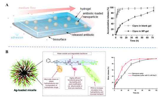 Examples of extended-release antimicrobial delivery systems based on polymeric nanocarriers. (A) (Left) Schematic illustration of tissue-adhesive nanoparticle–hydrogel hybrid (PLGA NP-gel) biomaterial system for sustained antibiotic release. (Right) The accumulative release profile of antibiotic Ciprofloxacin (Cipro) from Cipro-loaded PLGA NP-gel and Cipro-loaded blank gel without PLGA NPs in PBS buffer (adapted with permission from [38], copyright 2016 ACS). (B) (Left) Overall design of the degradable amphiphilic block terpolymer for assembly into NPs capable of silver-based antimicrobial delivery. (Right) Sustained-release profiles of silver cations from the NPs at 37 °C in pure water and PBS buffer (reproduced with permission from [40], copyright 2015 Royal Society of Chemistry).