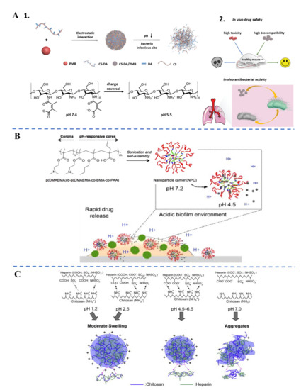 Examples of pH-responsive nanocarriers for antibiotic delivery. (A) (1) Schematic illustration of a pH-sensitive polyion nanocomplex for delivery of Polymyxin B (PMB). The NPs were prepared through electrostatic interaction of positively charged PMB and negatively charged 2,3-dimethyl maleic anhydride (DA)-grafted chitoligosaccharide (CS). (2) Schematics of in vivo drug safety, different from free PMB and CS-DA/PMB, and the mechanism of antibacterial activity of CS-DA/PMB (reprinted with permission from [48], copyright 2020 John Wiley and Sons). (B) The self-assembly structure and mode of action of acidic pH-sensitive micelles in delivering antibacterials in cariogenic dental biofilms (adapted with permission from (19), copyright 2015 ACS). (C) Illustrations of the physical structures of chitosan/heparin pH-sensitive NPs, an application in the treatment of H. pylori infection (reprinted with permission from [49], copyright 2009 Elsevier).