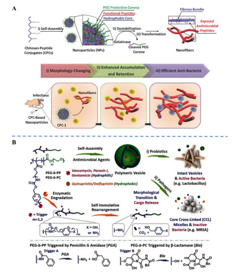 In another example, Qi et al. developed an “on-site transformation” strategy to precisely deliver antibacterial agents in the presence of gelatinase secreted by bacteria (Figure 5A) [60]. The design is based on transformable polymer–peptide conjugates consisting of three elements, a chitosan backbone, an enzyme-cleavable peptide with a polyethylene glycol (PEG) terminal, and an antibacterial peptide. The conjugates were self-assembled into NPs and morphologically transformed into nanofibers in the presence of gelatinase, leading to the high exposure of antimicrobial peptide residues with bacterial membranes. Taking advantage of the in situ morphological transformation, this strategy offered various merits in terms of increasing binding, effective accumulation, prolonged retention at the bacterial infection environment, and enhanced antibacterial activity.