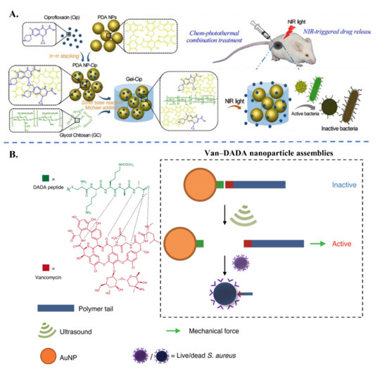 In another approach, ultrasound can be employed to destroy the non-covalent interactions (such as hydrogen bonds), leading to the activation of drugs from inactive macromolecules (Figure 6B) [80]. Inspired by the weak supramolecular binding between vancomycin with its H-bond complementary peptide target sequence (peptide-D-Ala-D-Ala), an ultrasound-triggered drug delivery system was fabricated by incorporating this supramolecular motif between polymer chains and gold NPs. Ultrasound applied in situ in the presence of S. aureus successfully lowered the MIC values of the formulations, highlighting the efficient supramolecular bond scission and activation of polymer-terminated vancomycin.