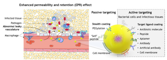 The enhanced permeability and retention (EPR) effect is the property through which macromolecules can extravasate and accumulate in injured areas such as inflammation, infection, infarcts, and especially in the tumor-vascularized area (angiogenic switch) [89,90,91]. The common feature of these lesions is frequently associated with abnormalities of the blood vasculatures, including the formation of an inter-endothelial cell gap (increasing vascular permeability) and dysfunctional lymphatic drainage (decreasing the efflux of macromolecules). In addition, bacterial components are also known to activate various inflammatory mediators that directly stimulate vascular permeability in the infection site [88]. Through this “passive” targeting mechanism, nanocarriers with prolonged blood circulation time have a better chance to accumulate at the infectious site, thereby enhancing antibiotic bioavailability (Figure 7). As a result, a higher antibiotic concentration to the site of interest would be obtained while reducing damage to surrounding tissues, which cannot be achieved by systemic administration of the free-form antibiotic.