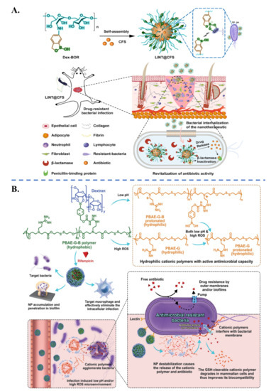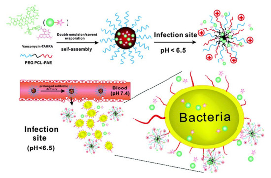 One of the most exploited stimuli in controlled-release antibiotic applications is pH. Indeed, the pH value of pathological tissues subjected to inflammation is significantly different from healthy tissue. The anaerobic fermentation in some bacteria, in which the products are organic acids such as lactic and acetic acids, and the inflammation response cause the pH of the site of infection to be significantly lower (pH 5–7) than the healthy tissue (pH 7.4). Based on this characteristic, many pH-sensitive nano-antibiotic systems have been widely designed by incorporating the ionizable groups or acid-labile bonds (hydrazine, amide, and ester linkages) in their polymer matrix [46,47]. These systems retain their stability during the systemic circulation under normal physiological pH conditions (pH 7.4) while collapsing in an acidic microenvironment, resulting in the release of the loaded antibiotic at the desired locations.