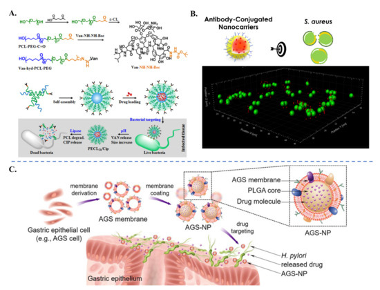 - Angsantikul, P.; Thamphiwatana, S.; Zhang, Q.; Spiekermann, K.; Zhuang, J.; Fang, R.H.; Gao, W.; Obonyo, M.; Zhang, L. Coating Nanoparticles with Gastric Epithelial Cell Membrane for Targeted Antibiotic Delivery against Helicobacter pylori Infection. Adv. Ther. 2018, 1, 1800016. [Google Scholar] [CrossRef]