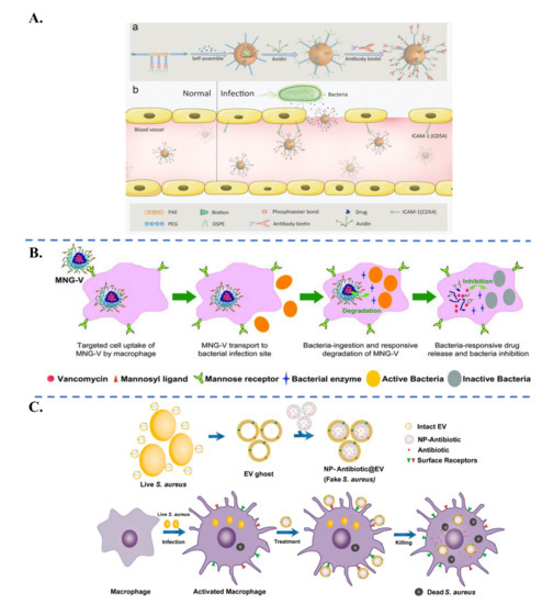 It must be noted that the accumulation of NPs in macrophages makes them potentially useful for the treatment of intracellular infections [92]. As a result, these targeting systems do not necessarily possess a prolonged circulation time in blood flow to ensure the efficient uptake of infected macrophages. In contrast, in the treatment of bacterial infections located outside the MPS, passive targeting requires nanocarrier systems exhibiting a longer circulation half-life to allow a sufficient amount of antibiotic cargos to reach the target area.