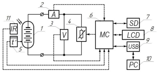 To assess the energy efficiency of PV installations, an information-measuring complex was proposed as a tool. The block diagram of the complex is shown in Figure 1. It allows automatic load regulation with simultaneous measurement, registration, and graphical display of voltage and current values. In addition, this complex allows you to measure and record the temperature of the environment and the surface of solar cells by the pyrometric method, as well as the intensity of solar radiation.