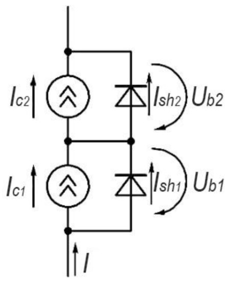 For a theoretical analysis of the processes occurring in PV installations with various switching options for solar cells operating in conditions of uneven illumination, a mathematical model of a solar cell was compiled, with an accuracy sufficient for engineering calculations—not exceeding the design tolerance. Thus, the initial mathematical model describing the operation of the solar cell model is as follows [19,20,21].