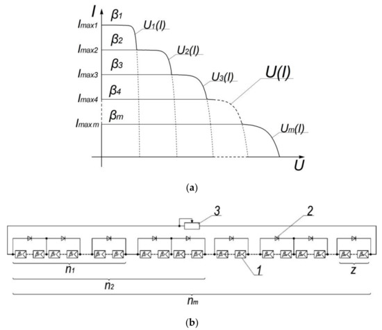 where is the number of groups with elements with different lighting; ,, …, are the number of elements in the corresponding group; , , …, are the maximum current of the corresponding group, (А); ,, …, are the photocurrent of the group with the corresponding value of the intensity of solar radiation , , …, , (A).
