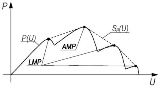 Obviously, the characteristic of each group of solar cells in such an installation has its own point of maximum power (МPP), which is the point of local maximum (LMP) general characteristics U(I). Wherein, that with the greatest power is the global extremum, or the point of the absolute maximum (AMP), determining the maximum power take-off from PV installations. МPP on the power characteristic of the solar cell array P(U) will be defined as the extremum of the curve drawn along the points LMP shown in Figure 4.