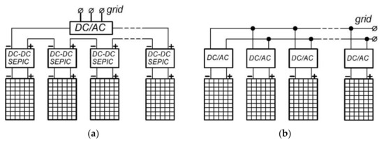 The outputs of individual matching converters are connected in a series (Figure 5a), which makes it possible to easily implement them in already built solar power plants. Switching of micro-inverters is carried out by means of their parallel connection (Figure 5b), which complicates their implementation at the constructed stations.