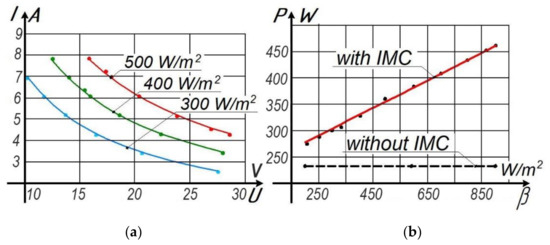 From the characteristics, it is seen that the current () can take values both above and below the current value at the point of maximum power of the characteristic of a group of solar cells connected to the input of an individual matching converter. Thus, at any value of the array current, the current at the output of the individual matching converter () is able to take on the same meaning =. Hence, when the solar cells group with such a converter, it is capable of transmitting electrical energy under any illumination, whether it be shading, pollution, or increased illumination (for example, when working in conjunction with solar concentrators).