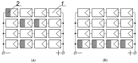 The operating principle of reconfigurable switching systems; (a)—solar modules before commutation; (b)—reconnected modules (1—normally lit module; 2—shaded module).