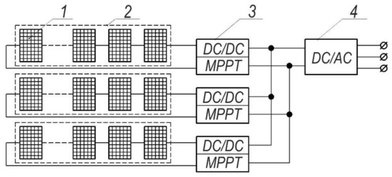 Block diagram of differentiated maximum power take-off systems (1—module; 2—array of modules; 3—voltage stabilizers with MPPT; 4—inverter).