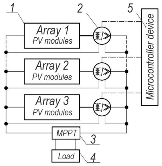 The voltage matching of parallel arrays of modules also allows for the use of differentiated maximum power take-off systems, the block diagram of which is shown in Figure 9 [41]. The principle of operation of such systems is that parallel arrays of modules transmit electrical energy through active voltage stabilizers, which set their output voltage to the same nominal value. At the same time, the converters search for the maximum power point (MPP) and optimize it. This allows for the maximum extraction of electrical energy from each array at their different illumination, temperature, or the use of PV panels in arrays with different characteristics.