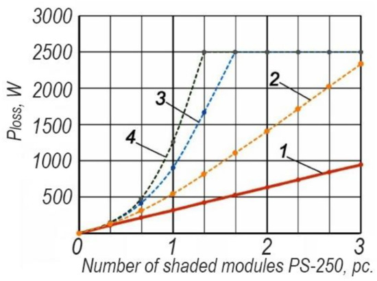 Graph of the dependence of the power losses of a PV battery on the partial shading of PV modules of one of the solar cell arrays (1—with APE; 2—consisting of three arrays of solar cells and installation of MPPT in AMP; 3—consisting of 10 arrays of solar cells and the installation of MPPT in AMP; 4—installing MPPT in LMP).
