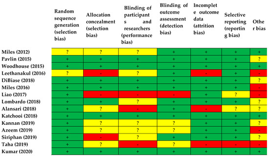 - Higgins, J.P.T.; Altman, D.G.; Gøtzsche, P.C.; Jüni, P.; Moher, D.; Oxman, A.D.; Savović, J.; Schulz, K.F.; Weeks, L.; Sterne, J.A.C.; et al. The Cochrane Collaboration’s tool for assessing risk of bias in randomised trials. BMJ 2011, 343, d5928. [Google Scholar] [CrossRef] [PubMed] [Green Version]