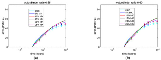 Figure 4a–d shows that at early ages, metakaolin composite concrete has less strength than plain concrete. At early ages, more metakaolin means lower concrete strength. When older, metakaolin composite concrete has greater strength than plain concrete because of the pozzolanic reaction of metakaolin. In other words, the proposed strength development model can reflect the crossover phenomenon of the strength between plain concrete and metakaolin composite concrete [30]. Moreover, the strength development model also found the strength development of concrete does not start immediately, but starts at a threshold age. Before this threshold age, the strength is zero, and after this threshold age, the strength is higher than zero. The threshold age is like final setting age. In concrete terminology, final setting is the starting time for hardening. In addition, the strength development model shows that as the water/binder ratio reduces, the strength of the concrete increases. Given a certain water content, larger quantities of binder have two effects. One is increasing the available binder for hydration, and the other is decreasing the extent of hydration. The overall results are the formation of more hydration products and higher compressive strength. This agrees with Abram’s law. Figure 4e shows experimental results versus analysis results. The root mean square error (RMSE) of the prediction was 3.72 MPa, the mean absolute percentage error (MAPE) of the prediction is 7.53, and the coefficient of determination (R2) was 0.982. This high coefficient of determination shows the accuracy of the proposed strength development model [31]. Summarily, the proposed hydration–strength model can give reasonable evaluation results of strength for metakaolin composite concrete with various mix combinations and various curing ages. Moreover, because the strength evaluation equation is a linear equation with three coefficients, three experimental data points of compressive strength are enough to calibrate the values of strength coefficients , , and . Compared with the huge amounts of experimental data used for machine learning-based methods, the number of experimental data required for the hydration-based strength model is remarkably low.
