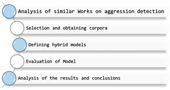 Figure 1 describes the methodology used in this work. In the first stage, a revision of the literature was made to get to know the models recently applied for aggression detection in Spanish texts. Then, the corpora to be used in this work was chosen. After this, the hybrid classification models are defined and implemented, considering the literature revision. In the next stage, the models are evaluated through experiments, measuring their performance using the metrics utilized in the literature. Finally, the results analysis of the evaluation is carried out, reaching conclusions on the hybrid models implemented.