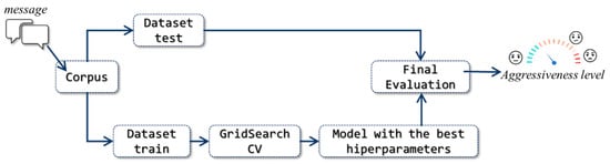 Using this application, the implemented models were tested on the test datasets of the three corpora: Chilean, Mexican, and Chilean-Mexican. The datasets used in the experiments are available at https://gitlab.com/ManuelLepeF/lexicon_ml_agresividad (accessed on 5 November 2021). It is worth highlighting that these datasets were not used in the training process, as Figure 2 shows. In this way, the generalization capacity of the models was measured using the F-measure and Accuracy metrics. The hyperparameters used in each model were found using the GridSearchCV technique in the different training datasets of the corpora.
