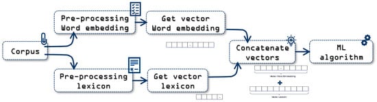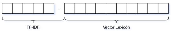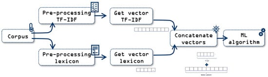 For this approach, a mix of the TF-IDF and Lexicon approach is implemented, where the features vector is a concatenation of the TF-IDF vector and the one derived from the Lexicons analysis. Figure 3 shows the process this approach performs. The corpus processing takes two routes to perform each approach, while the preprocessing of the corpus is done in each approach following its previously defined hyperparameters. Finally, these two vectors are concatenated, as shown in Figure 4, to apply the ML algorithms. The size of the TF-IDF vector depends on the vocabulary of each corpus, hence the final size of the vector is subject to the corpus the training is done with.